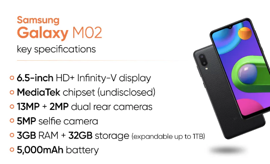 三星Galaxy M02的价格,规格和发售日期已经在手机正式发布时宣布。该手机带有一个用于自拍相机的水滴口,窄边框和背面垂直排列的双摄像头。三星Galaxy M02的背面具有独特的质感饰面,可提供舒适的握力。Galaxy M02的主要规格包括联发科芯片组,高达3GB的RAM,5,000mAh的电池,6.5英寸的HD + Infinity-V显示屏和13MP双摄像头。由于这是预算产品,因此该手机没有任何快速充电支持或物理指纹传感器来确保安全性。