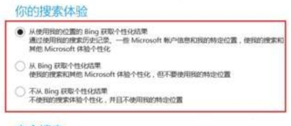 在这个页面中,还可以看到有【你的搜索体验】还有【安全搜索】的设置。可以通过设置是否是用自己的特定位置,是否获取个性化设置,还可以在安全搜索中为家里小朋友,筑起一道防火墙。