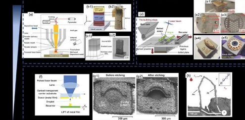 对于多个金属物体的微增材制造,目前主要采用固体LIFT和流体LIFT技术,因为它们的材料转移机制,将金属液滴从一个供体板喷射到建筑基材上,非常适合将不同材料打印在一起。在材料沉积过程中,供体与打印对象之间没有接触,因此避免了异种原材料交叉污染问题。微尺度金属增材制造技术的潜在应用包括:3D微尺度金属结构、储能元件、电子元件、生物分子、生化传感器和细胞,甚至直接将功能器件转移到其他部件的表面。