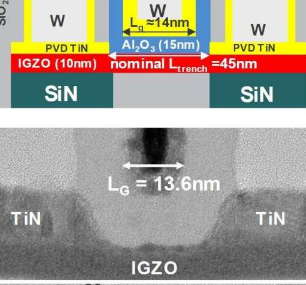 使用这种架构,IGZOTFT的栅极长度可以缩小到前所未有的14nm,同时仍然保持>100s的保留。通过等效氧化物厚度(EOT)缩放、接触电阻改进和减少IGZO层厚度来控制阈值电压(Vt),可以进一步优化小栅极长度下的保持率。当后者的厚度减小到5nm时,甚至可以省略O2中的氧隧道和退火步骤,从而大大简化了集成方法。