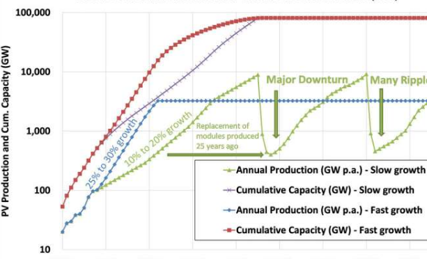 他警告说,虽然到2055年累计安装70或80太瓦的目标可以通过每年约15%的简单年增长率实现,但实现这一目标将导致太阳能光伏产业的规模大大超过必要的规模。当达到80兆瓦的目标时,这可能导致严重的下滑。