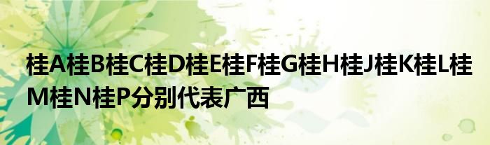桂A 南宁市 桂B 柳州市 桂C 桂林市 桂D 梧州市 桂E 北海市 桂F 南宁下辖县(马山、上林、宾阳、横县、隆安县;崇左市(扶绥县、大新县、龙州县、宁明县、天等县,凭祥市) 桂G 柳州下辖县(三江、融安、融水、鹿寨县等);来宾市(合山市、金秀、武宣、忻城、象州县) 桂H 桂林下辖县(灵川、兴安、全州、临桂、阳朔、平乐、荔浦、龙胜、永福、恭城、资源、灌阳县等等) 桂L 百色市 桂M 河池市 N 钦州市 桂P 防城港市