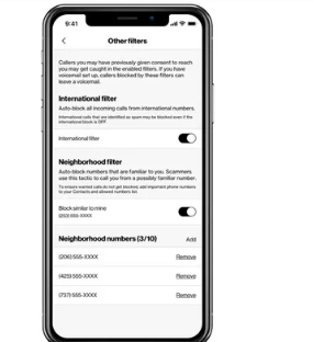 要激活邻居过滤器以阻止欺骗电话,请前往移动设备上的呼叫过滤器应用程序。(如果您使用的是 iOS,则需要从电话设置中的呼叫阻止和身份识别中切换过滤。)从应用程序主屏幕的下方导航菜单中,选择管理。从此菜单中,选择其他过滤器。在这里,您应该看到邻居过滤器,它会提示您输入与您的号码相似的六位数前缀和区号。确保打开它。