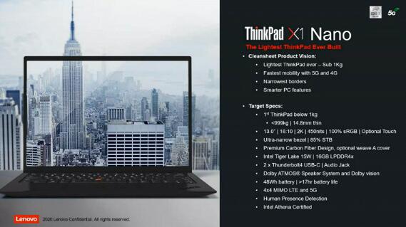 联想正准备发布其最轻巧的ThinkPad笔记本电脑。ThinkPad X1 Nano的重量不到1千克,虽然这并不是13英寸设备的最高记录,但它仍然是一个非常不错的数字。